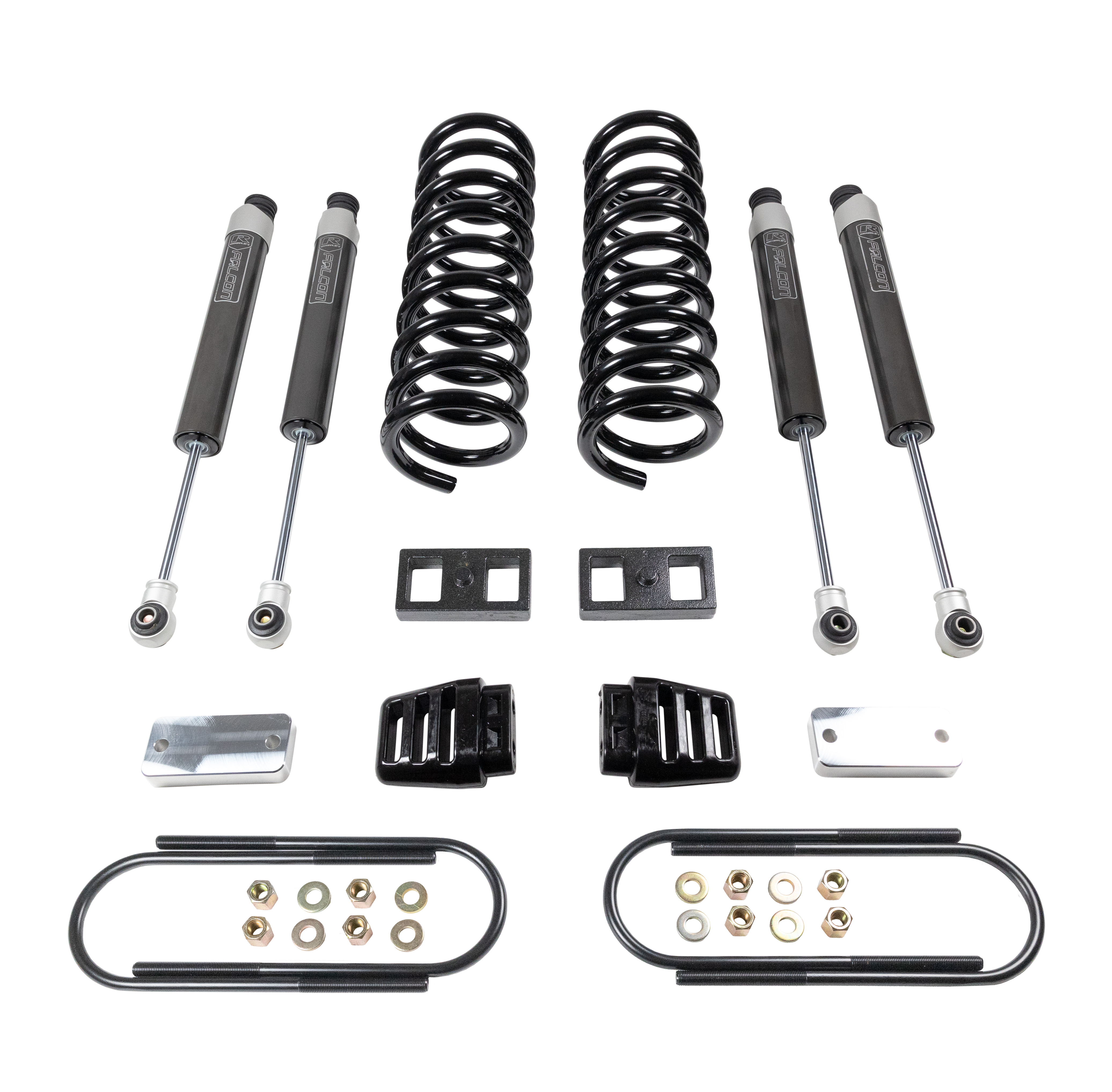 The new Ram HD 3" Coil Spring Lift Kit is specifically designed for Heavy-Duty applications utilizing ReadyLIFT-engineered new front coil springs and Falcon 1.1 Monotube front & rear shocks. The 3" kits are equipped with front and rear Falcon shocks, Heavy-Duty front coil springs, and bump stop spacers. The 3500 kit includes rear blocks and U-bolts to achieve a neutral, lifted stance. The 3" kits allow up to a 35x12.50 tire and 20x9 wheel with a 0 offset. ReadyLIFT's kit pro vides plenty of clearance for larger aggressive tires and wheels delivering a muscular, tough look, all while improving the factory ride quality.