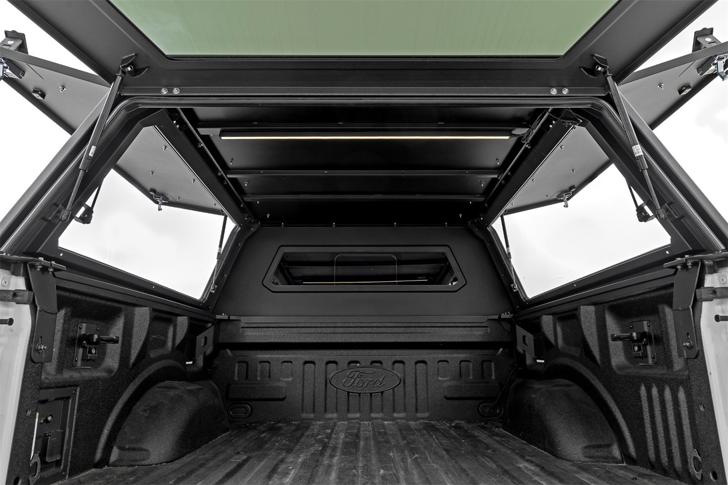 Rough Country's Bed Cap for the Ford F-150 is designed for the serious enthusiast who needs more than basic protection. Featuring full-opening gullwing doors for enhanced accessibility, customizable storage solutions with modular Molle panels and optional shelves, and tough lockable panels for security, this topper ensures your gear stays safe and visible with a third brake light. It includes an integrated LED strip for convenient illumination and is built with a durable stainless steel frame coated with a UV-resistant finish, weather-resistant rubber seals, and heavy-duty latches to keep everything secure in harsh conditions. Perfect for outdoor enthusiasts and contractors, it offers a rugged, feature-packed solution to elevate your truck's storage and functionality.